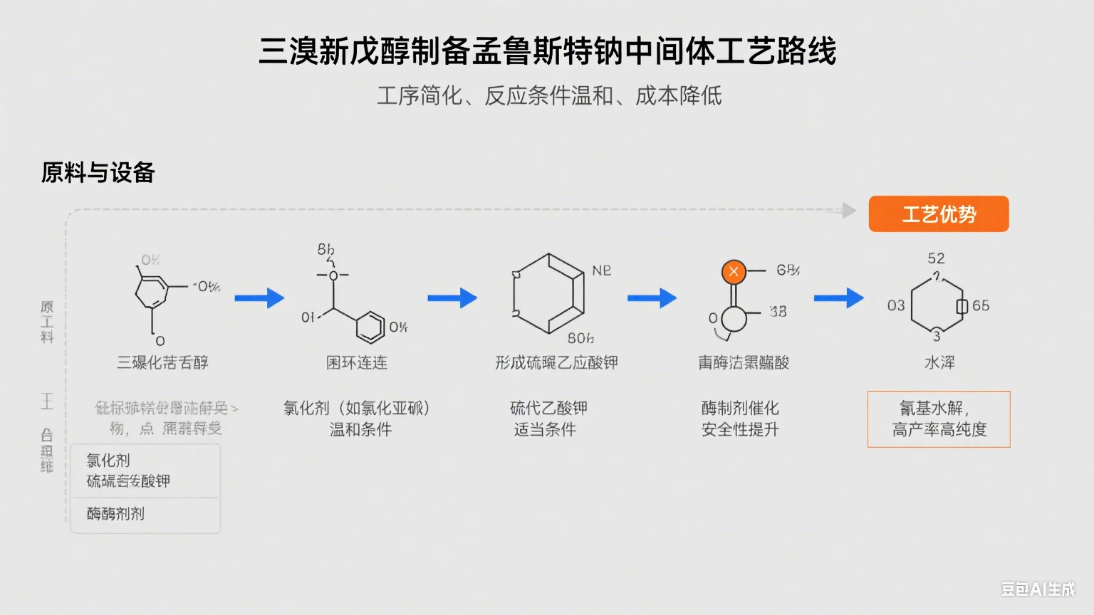 孟魯斯特鈉(Montelukast Sodium)是一種用于治 療哮 喘和過敏性鼻炎的有 效**,其中間體的制備對其** 終產物的質量和生產成本具有重要影響。本文介紹了一種通過三溴新戊醇合成孟魯斯特鈉中間體的工藝方法。與傳統方法相比,該工藝具有工序簡化、反應條件溫和、原料成本降低等優點,為孟魯斯特鈉的工業化生產提供了一條高 效、經濟的路線。
